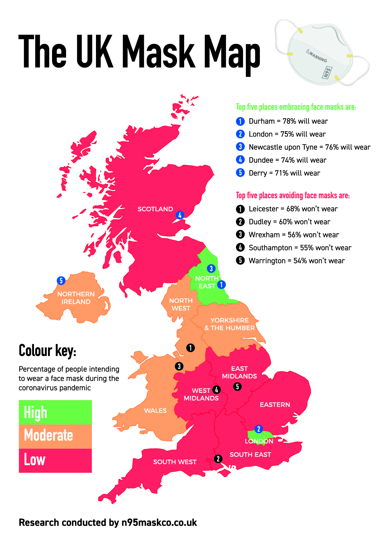 A new survey maps out the UK’s face mask wearing intentions with residents of Durham, London and Newcastle the most likely to wear a mask. On the flip side, those in Leicester, Dudley and Wrexham were the least likely.